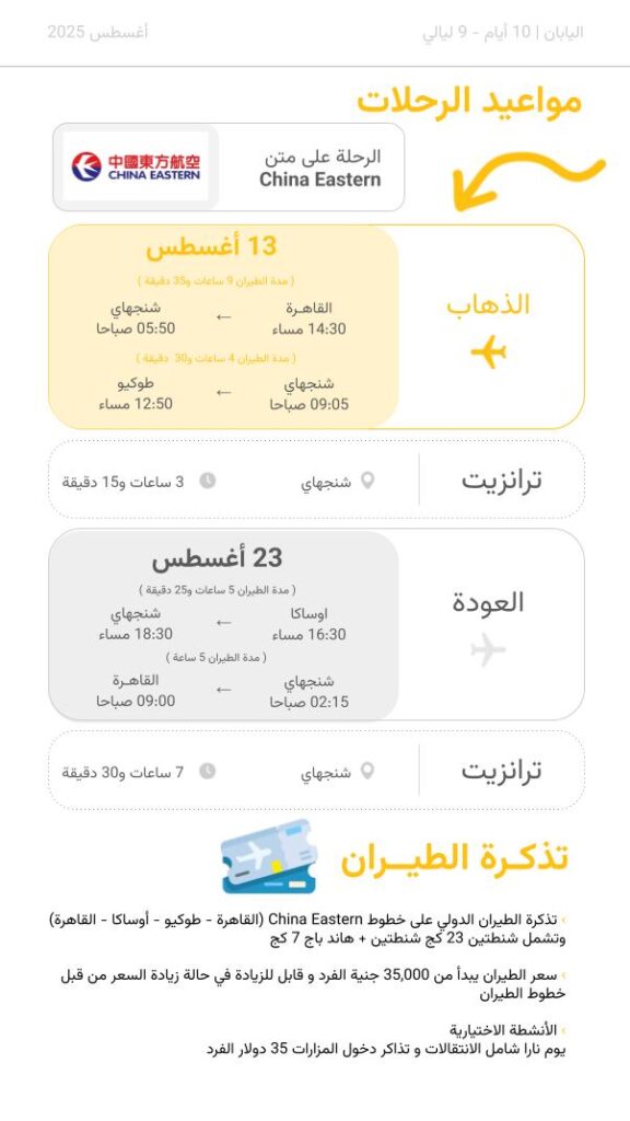 - Transfer to Osaka Airport by private vehicles and prepare for the return flight to Cairo.